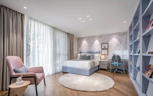 設(shè)計用莫蘭迪的調(diào)色板在空間中畫出一種生活美學(xué),霧霾藍(lán)、沁水粉、燕麥色……色彩上加以灰度的處理,予人純凈、自由且舒緩的感受,人的所有感官在這方靜謐中感知著美好以及最恰好的溫度。